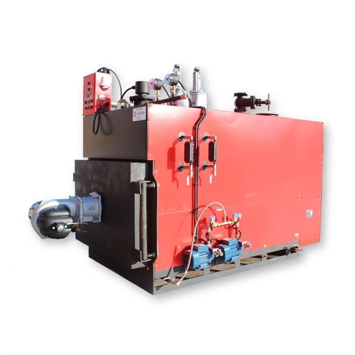 установка напольная, КПД 90%, топливо газ, дизель, отработанное масло, максимальная температура воды 165 °C, производительность 2000 кг/час, допустимое избыточное давление 0.8 МПа, рабочее давление 0.4 - 0.7 МПа
